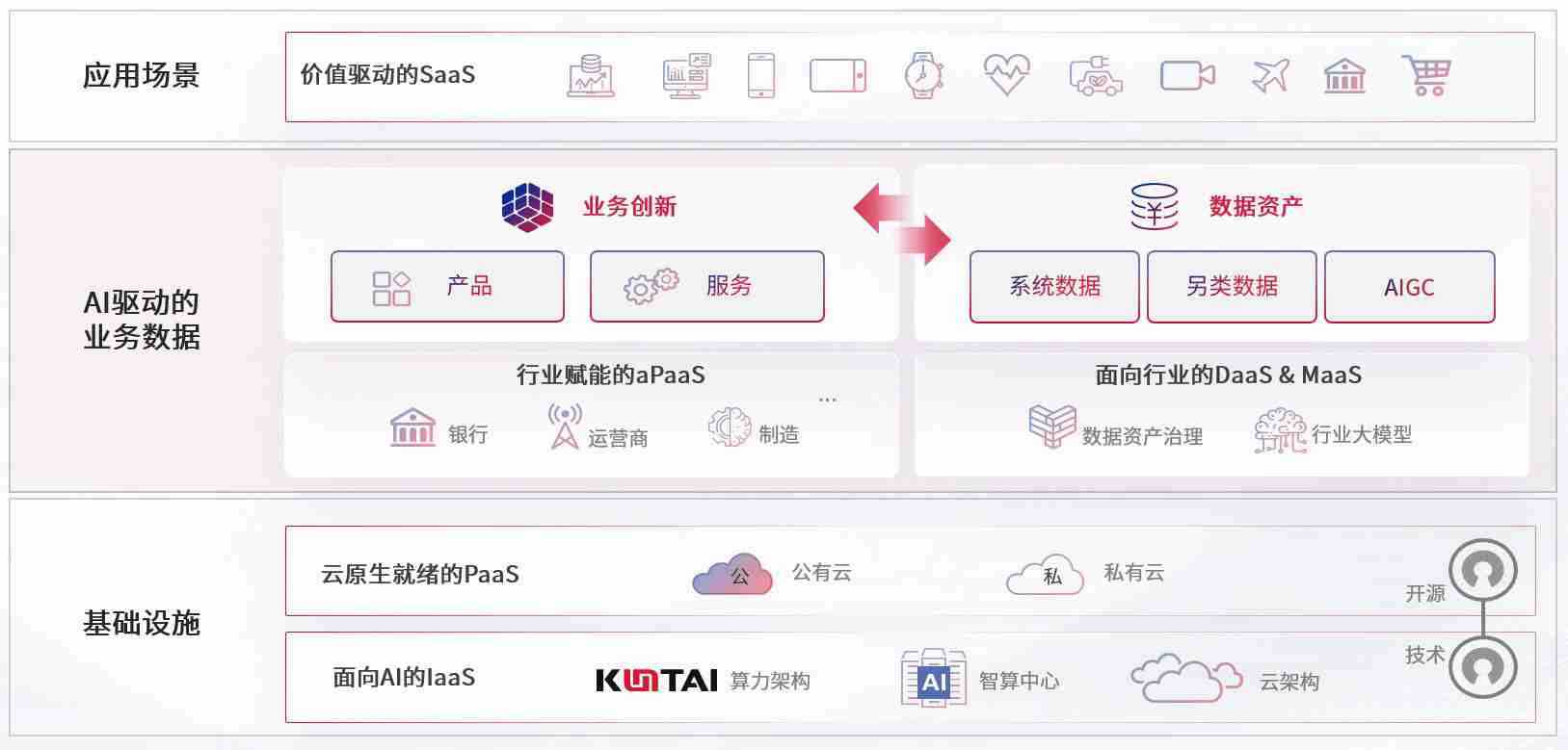 数字时代,,,围绕企业数字化转型的关键要素,,www.kaiyun.com数码开创性的提出数云融合战略和技术体系框架,,,,着力在云原生、、、、数字原生、、AI原生和信创产业上架构产品和服务能力,,,,为处在不同数字化转型阶段的快消零售、、、汽车、、、金融、、医疗、、、、政企、、、教育、、、运营商等行业客户提供泛在的敏捷IT能力和融合的数据驱动能力,,,构建跨界融合创新的数字业务场景和新业务模式,,,,助力企业级客户建立面向未来的核心能力和竞争优势,,全面推动社会的数字化、、、智能化转型升级。。
